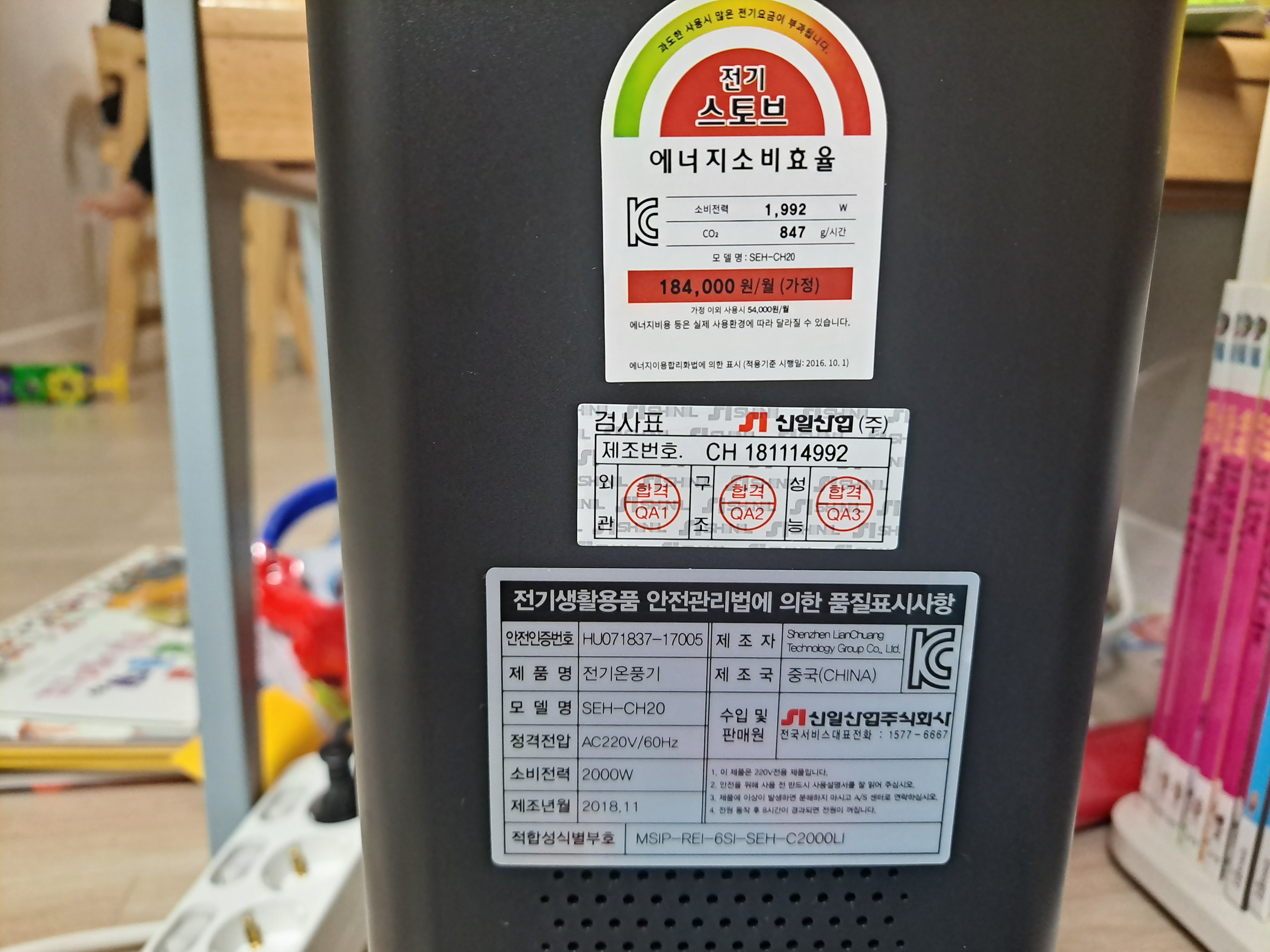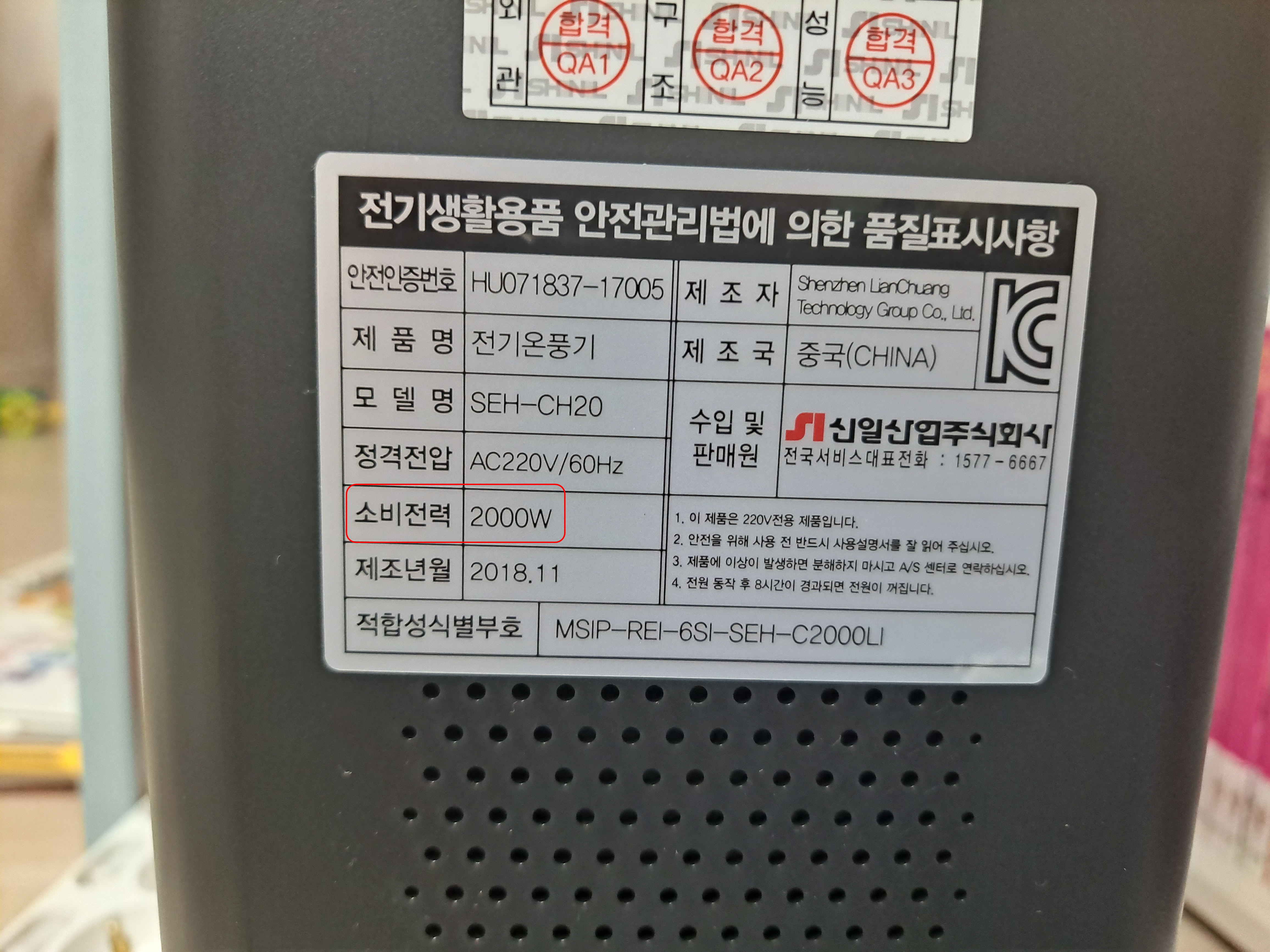 제가 구입한 온풍기의 경우 소비전력이 2000W입니다. 2000W를 기억해 두시고 다음 단계로 넘어갑니다.