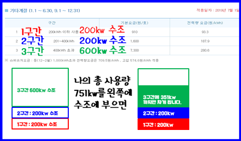 아래의 표처럼 전기 사용량이 많으면 어느 구간을 넘어선 순간 전기세 폭탄을 맞을 수 있습니다.